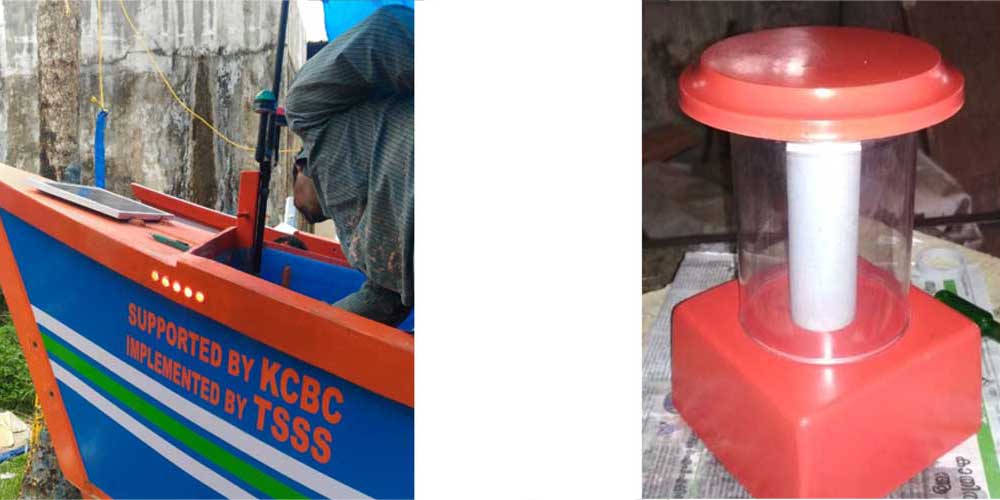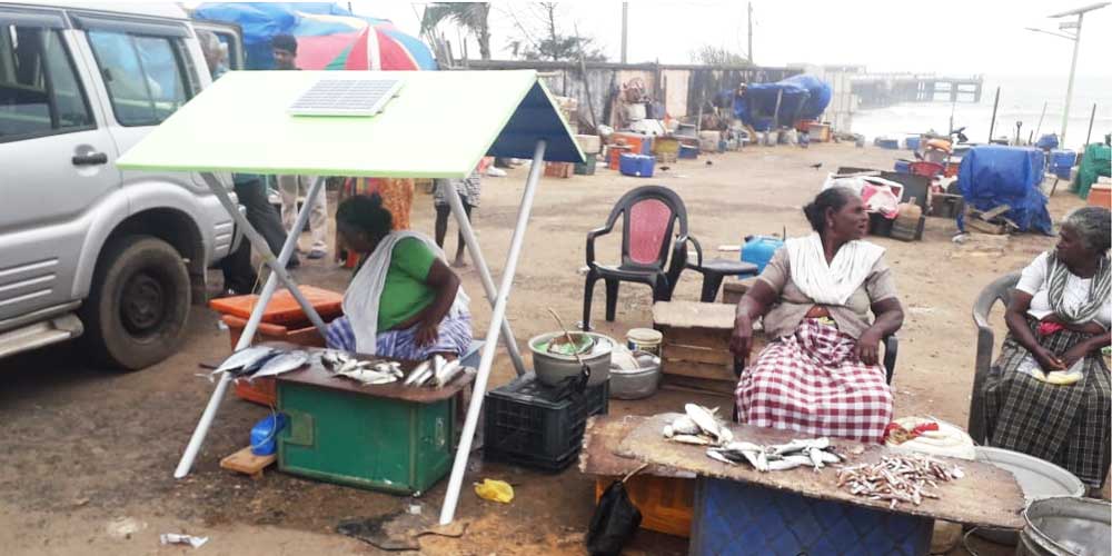 Fish vending women normally sit under the hot sun throughout the day and during the night in dim light with the aid of kerosene light or candle. We have made a FRP awning with solar power that provides both shade in the daytime and illumination at night for the vendor and her customers.